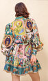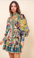 Enerjik renk paleti ve sanatsal deseniyle stilinize canlılık katan bu mini elbise, özel günlerde ve şehir şıklığında öne çıkmak isteyenler için tasarlandı. Büzgü detaylı beli, hacimli kolları ve volanlı eteğiyle feminen bir siluet sunar.