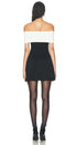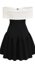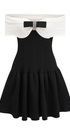 Bu zarif omuzları açık mini elbise, fiyonklu tasarımıyla şık, küçük çekici bir stile sahiptir ve incelikli bir dokunuş katar. Figürü güzelleştiren kesimi ve benzersiz yama detayı, onu her türlü şık durum için mükemmel kılar.