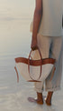 Desenli, katlanmış ve kıvrımlı bir kompakt tote çanta. Sapları elde düğümlenmiş olup, imza şeklini vurgular. Kanvas edisyonu, deri tabanı ile güçlendirilmiş yaz esintili bir yorumdur.
