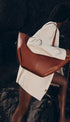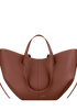 Bu dalgalı, katlı ve kıvrımlı tasarıma sahip heykelsi tote çanta iki şekilde kullanılabilir. Sepet tarzı, yanları açık ve askıları dışarıda, ya da yanları içe katlanmış ve askıları içte çaprazlanmış çiçek benzeri kapalı çanta olarak.