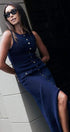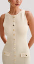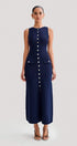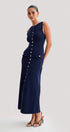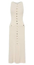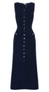 Yuvarlak yakalı ve kolsuz tasarıma sahip bu zarif maksi elbise, modern tarzı klasik detaylarla birleştiriyor. Düz etek şekli ve ön sahte cepler, altın düğmelerle süslenerek sofistike bir dokunuş katıyor. Yüksek esnekliğe sahip trikodan üretilen bu ürün, vücudunuzu rahatça güzelleştiren güzel bir uyum sağlar.