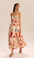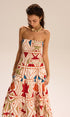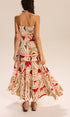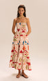 Renk Bloklu Straplez Katmanlı Uzun Elbise