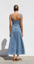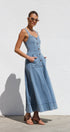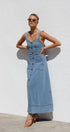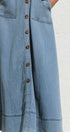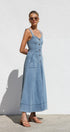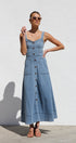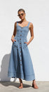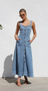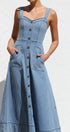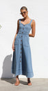 Gardırobunuzu bu şık orta mavi kot midi elbiseyle güncelleyin. Zamana meydan okuyan bir görünüm için ayarlanabilir kalın askılara ve göz alıcı kalp yakaya sahiptir. Ön kısımda uzanan suni düğme detayı klasik bir çekicilik katarken, ön cepler pratik işlevsellik sunar.