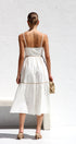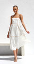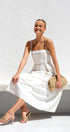 Şık, sofistike bir görünüm için kontrast boz kahverengi süslemeli bu beyaz elbiseyle zamansız zarafeti kucaklayın. Ayarlanabilir spagetti kayışları kişiye özel bir uyum sağlarken, görünmez yan fermuar pürüzsüz ve parlak bir görünüm sağlar.