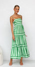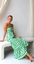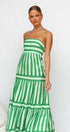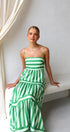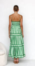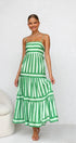 Yeşil çizgili tasarıma sahip Yeşil Laina Elbise ile gardırobunuzu zenginleştirin. Bu maksi elbise, ayarlanabilir spagetti askıları ve kişiye özel uyum için elastik büzgülü arka kısmıyla koyu ve açık yeşil çizgilerin çarpıcı kontrastını sergiliyor. Elbise göğüs çizgisinin altından zarif bir şekilde uzanarak zarif siluetini vurguluyor.