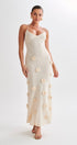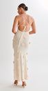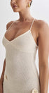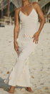 V yakalı ve çapraz fonksiyonel askılara sahip bu çarpıcı bodycon maksi elbiseyle bir etki yaratın. Çiçek aplikesi zarafet katıyor, yüksek esnekliğe sahip triko ise vücudunuza uyum sağlayan hoş bir uyum sağlıyor.
