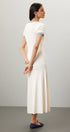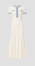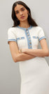 Bu bilek boyu örgü elbise, yıpranmış denim şerit ve iki göğüs yama cebiyle klasik yuvarlak yakasına ve kısa kollarına şık bir görünüm katıyor. Kabartmalı düğmeler benzersiz tasarımı güçlendirirken düz etek kısmı modern bir siluet sunar.