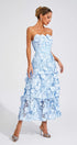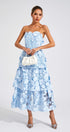 Estella Mavi Çiçek Düşük Omuz Uzun Elbise