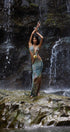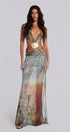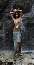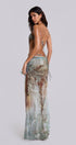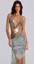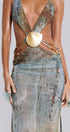 Derin dekolteli ve düşük belli tasarıma sahip bu dramatik maksi elbiseyle kendinizi gösterin. Halter yaka tarzı zarafet katarken, çıkarılabilir gerçek deniz kabuğu süslemesi ve boncuklu kalça zincirleri kişiselleştirilebilir bir zarafet sunuyor.