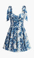 Çiçek Desenli Bağcıklı Kalp Yaka Elbise