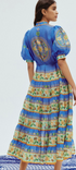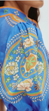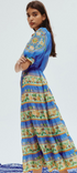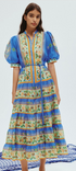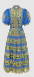 Canlı mavi zemin üzerine işlenmiş çiçek desenleriyle dikkat çeken bu romantik elbise, hacimli kolları ve yüksek yakasıyla retro-modern bir görünüm sunuyor. Bel kısmındaki ince kuşak, silueti nazikçe vurgularken; hafif kumaşı ve rahat kesimi yazın en şık kaçamağına eşlik edecek.