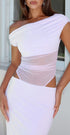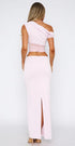 Kızlar Gecesi Pudra Maxi Elbise sizi kesinlikle ilgi odağı yapacak! Tek omuzlu tasarım, omuzlarda fırfırlı detaylar, şeffaf, fileli korsaj, kesik detaylar, maksi uzunluk, sırtta yırtmaç detayları ve gizli fermuar ve toka kapatma özelliğine sahip.
