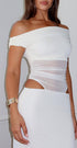 Kızlar Gecesi Beyaz Maxi Elbise sizi kesinlikle ilgi odağı yapacak! Tek omuzlu tasarım, omuzlarda fırfırlı detaylar, şeffaf, fileli korsaj, kesik detaylar, maksi uzunluk, sırtta yırtmaç detayları ve gizli fermuar ve toka kapatma özelliğine sahip.