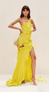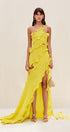 Tek Omuzlu Fırfırlı Şifon Elbisemizle görkemli bir giriş yapın. Yere kadar uzanan bu elbise, kuyruklu ve şık yan yırtmaçlı, dramatik tek omuzlu bir tasarıma sahiptir. Çift katlı şifon kumaş, fırfırlı detaylarla birleşerek büyüleyici ve zarif bir siluet yaratıyor.