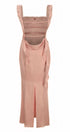 Kare yakalı ve çift kat göğüslü bu zarif maksi elbiseyle sofistikeliği kucaklayın. Fırfırlı kurdele ve sarkan yaka dramatik bir hava katıyor, sırtı açık tasarım ise şıklığını artırıyor. Orta derecede esnek saten ve polyesterden üretilen bu elbise, şık ve rahat bir uyum sunar.