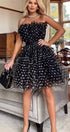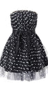 Puantiyeli Mini Elbisemizle eğlenceli ve sofistike bir adım atın. Büzgülü tül korsaj ve sabit grogren kemer içeren bu elbise, hoş kalpli yakayı büyüleyici puantiyeli baskıyla birleştiriyor.
