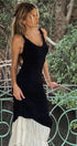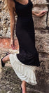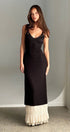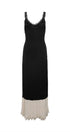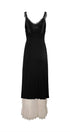 Bedene oturan bir silüete ve dantel detaylarla süslenmiş V şekilli yakaya sahip maksi elbisemizde sofistike bir görünüm sergileyin. Kontrast büzgülü kumaş ve katmanlı krem rengi örgü etek kısmı doku ve zarafet katıyor, marul fırfırlı etek kısmı ise elbisenin eşsiz çekiciliğini artırıyor.