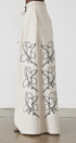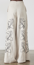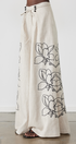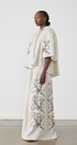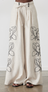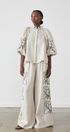 Oversize gömlek kesimi, balon formda kollar ve geniş paça pantolonla birleşerek dengeli bir silüet sunar. Kol, yaka ve pantolon paçalarındaki büyük floral siyah nakışlar ise tasarıma karakteristik bir görünüm kazandırır.