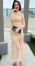 Yuvarlak yakalı ve uzun kollu bu büyüleyici maksi elbiseyle sade zarafeti kucaklayın. Pilili tasarım ve şeffaf alt kısım sofistike bir dokunuş katarken, örgü kumaş rahatlık için orta derecede esnekliğe sahip, güzel bir uyum sunar.