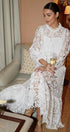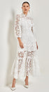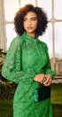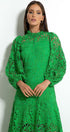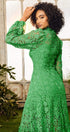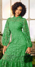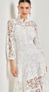 İşlemeli dantelden üretilen bu zarif bilek boyu elbiseyle zamansız zarafeti keşfedin. Karmaşık dantel detayları ve dantel kesimli balon kolları sofistike bir dokunuş katarken, geniş fırfırlı etek kısmı zarif hareketini artırıyor.