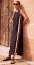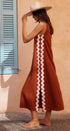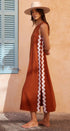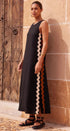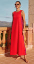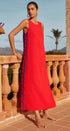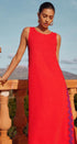Yan kısımlarda kontrast beyaz ve mor ric rac detaylarıyla süslenmiş canlı kırmızı bir tabana sahip, çarpıcı kolsuz maksi elbisemizle kendinizi ifade edin. Yüksek yuvarlak yaka ve anahtar delikli tek düğmeli arka kısım, bu zahmetsiz şık parçaya sofistike bir dokunuş katıyor.