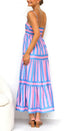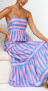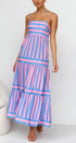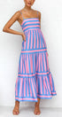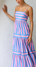 Canlı çizgili tasarıma sahip Pembe/Mavi Laina Elbisenin cazibesini keşfedin. Bu maksi elbise, pembe ve mavi şeritleri, ayarlanabilir spagetti askıları ve elastik büzgülü sırt kısmıyla birleştirerek kişiye özel bir uyum sağlar. Elbise göğüs çizgisinin altından zarafetle akıyor ve zarif bir siluet sunuyor.