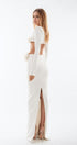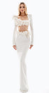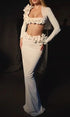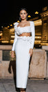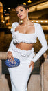 Bu takım, sofistike bir görünüm için uzun, düz bir etekle eşleştirilmiş, süslenmiş çiçek detaylarıyla süslenmiş uzun kollu kısa bir üstten oluşuyor. Bandaj kumaşı, konfor ve şekil için hafif bir esneme ile mükemmel bir uyum sağlar.