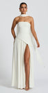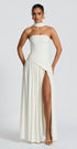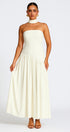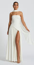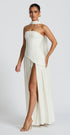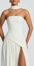 Klasik Fildişi Maliyah Maksi Elbise ile gece görünümünüzü yükseltin. Bu straplez maksi elbise, yapılandırılmış ancak zarif bir uyum için şık. Akıcı kontrast georgette etek zahmetsizce dökülür ve cesur bir cazibe dokunuşu için uyluk yüksekliğinde bir yırtmaçla tamamlanır. Eşleşen eşarp ile tamamlanan Maliyah Maksi Elbise, modern sofistikeliğin özüdür.