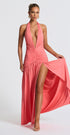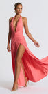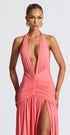 Melania, tek kelimeyle “iddialı”. Cesur derin V yaka detayı ve stratejik büzgü kesimiyle, vücut hatlarını kusursuzca vurgulayan bu tasarım; sahne ışıkları kadar senin de parlamanı sağlıyor. Yüksek yırtmaç detayıyla adım attıkça etkisi büyürken, boyundan bağlamalı modeli zarafeti ve feminenliği birleştiriyor.