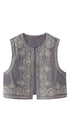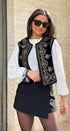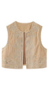 Lüks polyesterden üretilen, pırlantalarla süslenmiş, önü açık yeleğimizle tanışın. Bu hırka, şık tasarımını öne çıkaran göz kamaştırıcı yapay elmas vurgularıyla zarafeti ve konforu birleştiriyor.