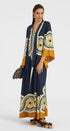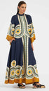 Yüksek yakalı, dökümlü formdaki kaftan kesimi ile maksimum konfor ve şıklık bir arada sunulur. Siyah, ekru ve petrol tonlarındaki büyük yaprak ve motif desenleri; göz alıcı, özgün bir tarz yaratır. Kollar serbest kesimlidir, vücut hatlarını sarmaz.