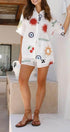 Çarpıcı siyah çizgili baskıya sahip bej tabanlı bu hafif iki parçalı örgü setle zahmetsiz tarzı keşfedin. Set, havadar ve gündelik bir görünüm için astarsız ve yarı şeffaf, rahat kesim, yakalı, düğmeli bir üst içerir.