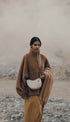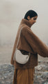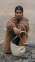 Ahşap bir kalıp üzerinde deriyi şekillendirilerek elde edilen “Rivah” çantasının yuvarlaklığı, bükülmüş metal tokaya karışan katları tarafından şekillendirilir. Çantanın kontrast oluşturan gövdesi ve omuz askısı, düz ve dokulu derilerden oluşur.