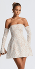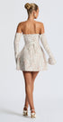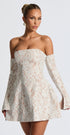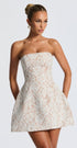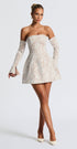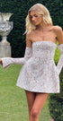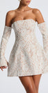 Modern zarafet, dantel ile buluştu. Salone Mini Dress, vintage ilhamlı dokusuyla romantik bir havaya sahipken, kalıplı yapısıyla modern bir siluet sunuyor. Straplez üst kısmı ve çıkarılabilir dantel eldivenleriyle ister sade ister dramatik bir görünüm yakalayabilirsin. Nişan, bridal shower veya özel davetler için kusursuz bir tercih.