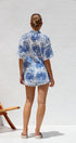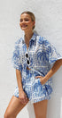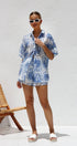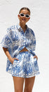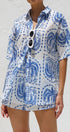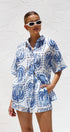 Beyaz zemin üzerine mavi baskıya sahip bu şık iki parçalı setle gardırobunuzu güncelleyin. Set, şık ve gündelik bir görünüm sunan, kutu gibi bir silüet ve hafif yuvarlak alt kenarlı, rahat kesimli, yakalı, düğmeli bir gömlek içerir. Üst kısım astarsız ve şeffaftır, katmanlama için mükemmeldir.