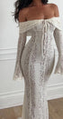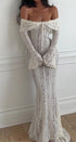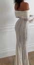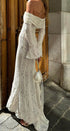 Bu zarif dantel çan kollu elbise, omuzları açıkta bırakan şık bir tasarıma ve askısız kalp yakaya sahiptir ve göz kamaştırıcı, kadınsı bir siluet yaratır. Dar bel ve etkileyici kuyruk, sofistike bir görünüm katarken, Fransız esintili stili her türlü resmi etkinlikte öne çıkmanızı sağlar.