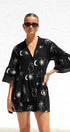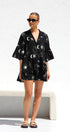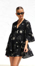 Bol kesimli ve siyah zemin üzerine sofistike bej baskıya sahip bu önlük tarzı elbiseyle zahmetsiz zarafeti deneyimleyin. Hafif bir parıltıya sahip orta uzunlukta kollar zarif bir dokunuş katarken, işlevsel düğmeli ön kısım çok yönlü stil seçenekleri sunar.