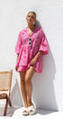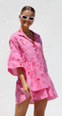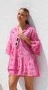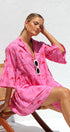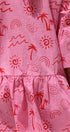 Büyük beden kesime ve pembe zemin üzerine koyu kırmızı baskıya sahip önlük tarzı elbisemizle zahmetsiz stili deneyimleyin. Hafifçe genişleyen orta uzunlukta bir kolla tasarlanan bu elbise, konforu bir incelik dokunuşuyla birleştiriyor. Fonksiyonel düğmeli ön kısım çok yönlülük katarken, asimetrik, katmanlı ve katlı etek dinamik ve hoş bir siluet yaratıyor.