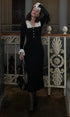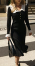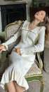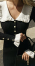 Bu diz boyu elbise, büyüleyici bir Peter Pan yakasına ve geniş fırfırlı etek kısmı da dahil olmak üzere karmaşık fırfırlı detaylara sahiptir. V yakalı ve suni inci düğmeler, vücuda oturan siluetine zarafet katıyor.