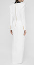 Sivri yakalı ve altın düğmelerle süslenmiş kruvaze tasarıma sahip bu uzun elbiseyle tarzınızı yükseltin. Yüksek yırtmaç, cesur renk bloklu desene çekici bir dokunuş katıyor. Tencel, pamuk ve polyester karışımından üretilen elbise, orta düzeyde esnekliğe sahip, hoş bir kesim sunar ve daha fazla konfor için tamamen astarlıdır.
