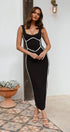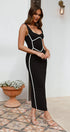 Kolay giyim için görünmez bir arka fermuara sahip elbise, daha fazla hareket için şık bir arka bölmeye de sahiptir. Beyaz kontrast detaylandırma çarpıcı bir görsel etki yaratarak bu parçayı tarzıyla öne çıkmak istediğiniz özel günler için mükemmel kılıyor!