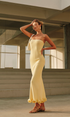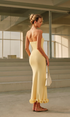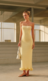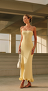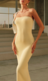 Kadın uzun elbise, straplez örgü elbise, sarı yazlık elbise, vücuda oturan elbise, minimal şık elbise ve 2025 yaz elbise trendleri arayanlar için Barzello'nun imzasını taşıyan zarif bir favori.
