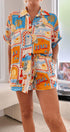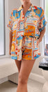 Bu set gevşek bir bağlantı özelliğine sahiptir. uyumlu şortlarla eşleştirilmiş kısa kollu gömlek. her ikisi de canlı bir baskıyla süslenmiştir.