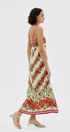 - Tasarım: Bitki temalı baskılı, ince askılı, yüksek belli elbise