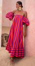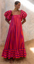 Güneşin altında dans eden renklerin enerjisini taşıyan Desert Bloom Elbise, hacimli balon kolları, fırfırlı eteği ve dramatik çizgileriyle unutulmaz bir siluet yaratıyor. Pembe ve kırmızının büyüleyici uyumu; ister şehirde ister bir sahil kasabasında, girdiğiniz her ortamda sizi yıldızlaştırır. Geniş hasır kemeriyle tamamlanan bu parça, modayı sanata dönüştürüyor.