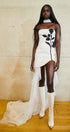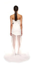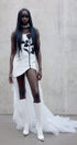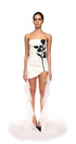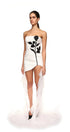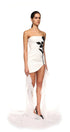 Bu mini elbise, askısız kesim ve büyüleyici kristal çiçek desenli süslemelerle çarpıcı asimetrik bir tasarıma sahiptir. Tülle kaplı kuyruk dramatik bir zarafet katarken, kontrast oluşturan süslemeler şıklığını artırıyor.